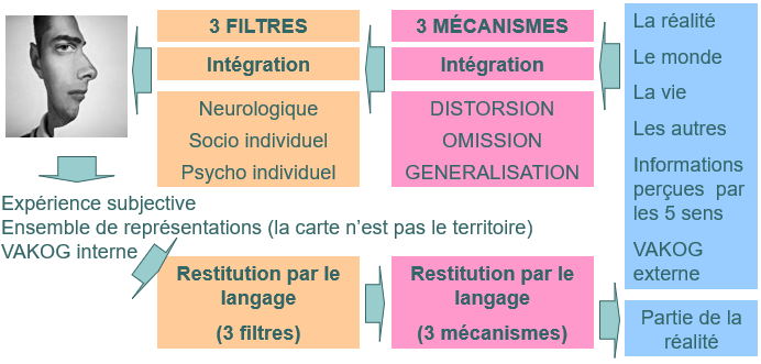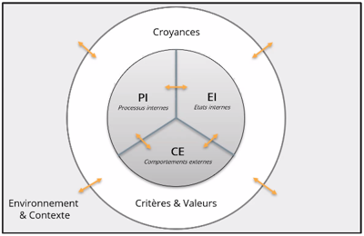 De mon parcours en PNL j'ai également appris que les émotions (états internes), les représentations (processus internes) et les comportements sont intimement liés. Ces trois composantes sont interagissantes tant au niveau conscient qu'inconscient.